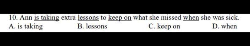 Dịch: Ann đang học thêm để theo kịp những bài học cô ấy đã bỏ lỡ khi bị ốm.