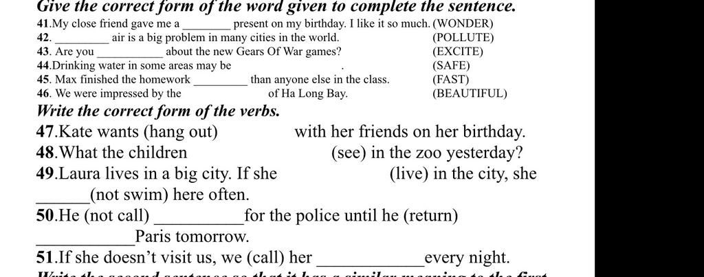 49. câu điều kiện loại 1, vì cô ấy sống ở 'city' nên được; chuyển "live" thành lives" , "not swim" thành "will not/ won't swim " . (câu này sai thì tui không biết gì đâu nhé ) .