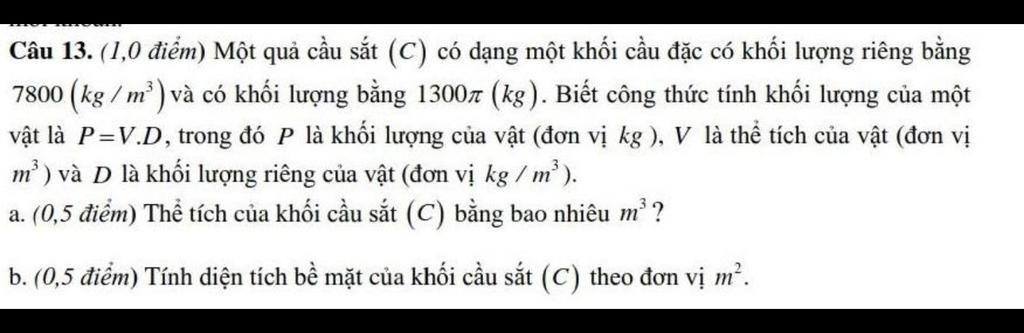 a, P=V.D ⇔ V=`P/D` = `(1300π)/7800` = `π/6` (`m^3`) (đáp số)