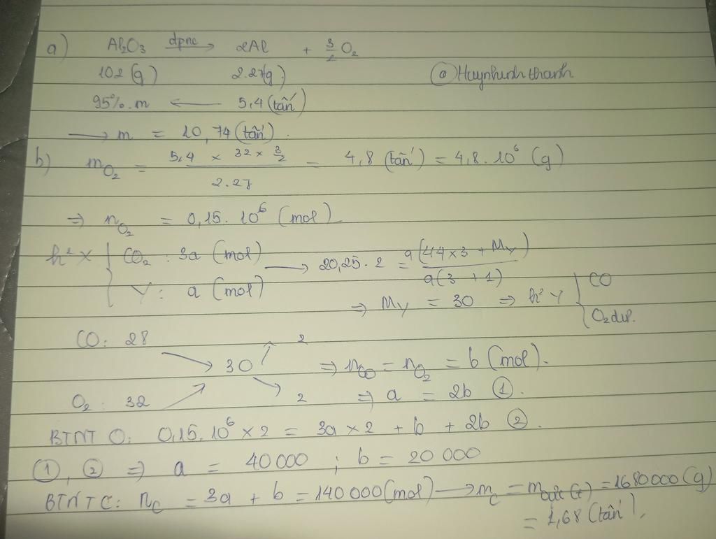 b) O2 sinh ra phản ứng với cực dương tạo ra hỗn hợp khí X (trong đó CO2 chiếm 75% về thể tích) có tỉ khối so với hydrogen bằng 20,25. Tính khối lượng (tấn) cực dương đã bị đốt cháy trong quá trình sản xuất 5,4 tấn nhôm.