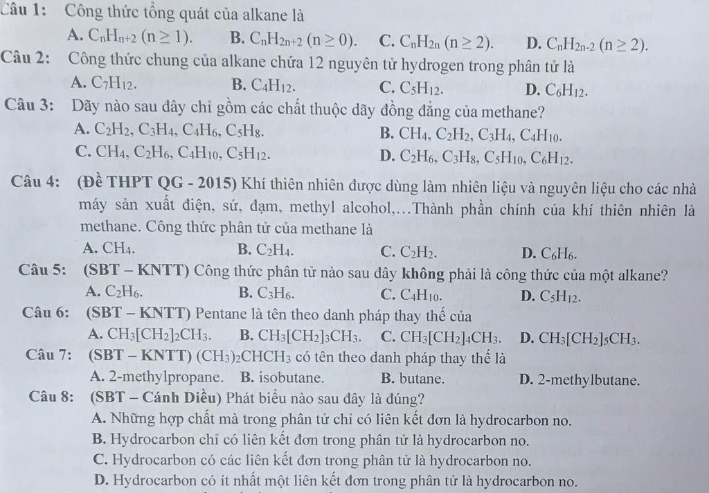 `->` Công thức tổng quát của alkane : $\rm C_nH_{2n+2} $ (`n>=1`)