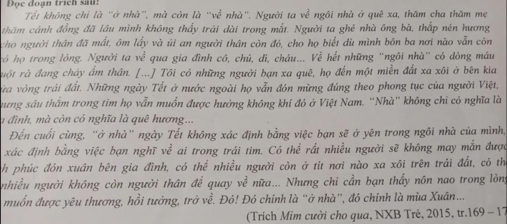Một bài học quan trọng khác mà em nhận ra là giá trị của tình cảm vượt xa những vật chất. Nhiều người có thể sống xa nhà, không có điều kiện trở về bên gia đình mỗi dịp Tết, nhưng trái tim họ vẫn đầy ắp tình yêu thương. Điều này cho thấy rằng, cảm giác "ở nhà" không chỉ đến từ không gian vật lý mà còn từ cảm xúc mà chúng ta dành cho nhau. Em sẽ cố gắng mở lòng, giao tiếp và giữ gìn mối quan hệ với mọi người xung quanh, bởi những kết nối này giúp ta cảm thấy an toàn và bình yên. Hơn nữa, đoạn trích cũng khiến em nhận ra rằng không phải ai cũng có được may mắn bên người thân. Một số người có thể phải trải qua những mất mát, hoặc sống trong cô đơn. Điều này thúc đẩy em phải biết trân trọng những gì mình đang có, không chỉ trong dịp Tết mà cả trong cuộc sống hàng ngày. Em cần hiểu rằng những nỗ lực chăm sóc và vun vén cho mối quan hệ với gia đình và bạn bè là một phần thiết yếu để tạo nên sự gắn bó và hạnh phúc.