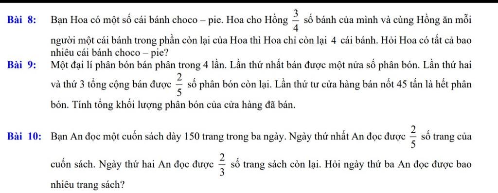 người một cái bánh trong phần còn lại của Hoa thì Hoa chỉ còn lại 4 cái bánh. Hỏi Hoa có tất cả bao