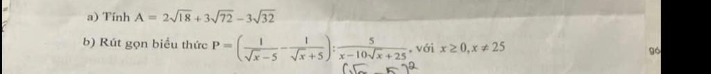`b)` `P = (1/(sqrtx-5) - 1/(sqrtx+5)) : 5/(x - 10 sqrtx + 25) (x >= 0; x ne 25)`