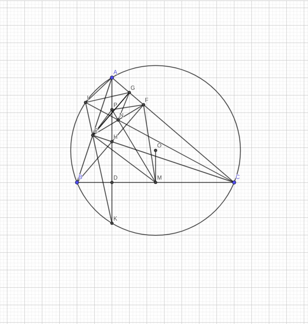 cho tam giác abc có 3 góc nhọn nội tiếp đường tròn (O;R) các đường cao ad,bf,ce của tam giác abc cắt nhau tại h a)chứng minh tứ giác behd nội tiếp 1 đường tròn b)kéo dài ad cắt đường trong(O) tại điểm thứ 2 k.kéo dài ke cắt đường tròn (O) tại điểm thứ 2 i.gọi n là giao điểm của cl và ef.chứng mnh ce^2=cn.ci c) kẻ om vuông góc vs bc tại m.gọi p là tâm đường tròn ngoại tiếp tam giác aef.chứng minh 3 điểm m,n,p thẳng hàng