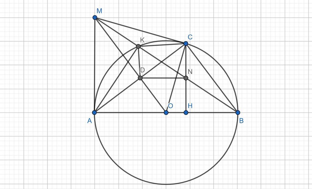 Cho đường tròn tâm O, đường kính AB. Trên tiếp tuyến của đường tròn (O) tại A lấy điểm M ( M khác A). Từ M vẽ tiếp tuyến thứ hai MC với (O) (C là tiếp điểm). Kẻ CH vuông góc với AB (), MB cắt (O) tại điểm thứ hai là K và cắt CH tại N. Chứng minh rằng: