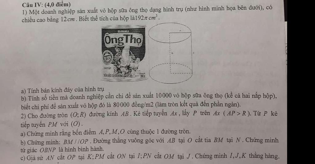 1) Một doanh nghiệp sản xuất vỏ hộp sữa ông thọ dạng hình trụ (như hình minh họa bên dưới), có