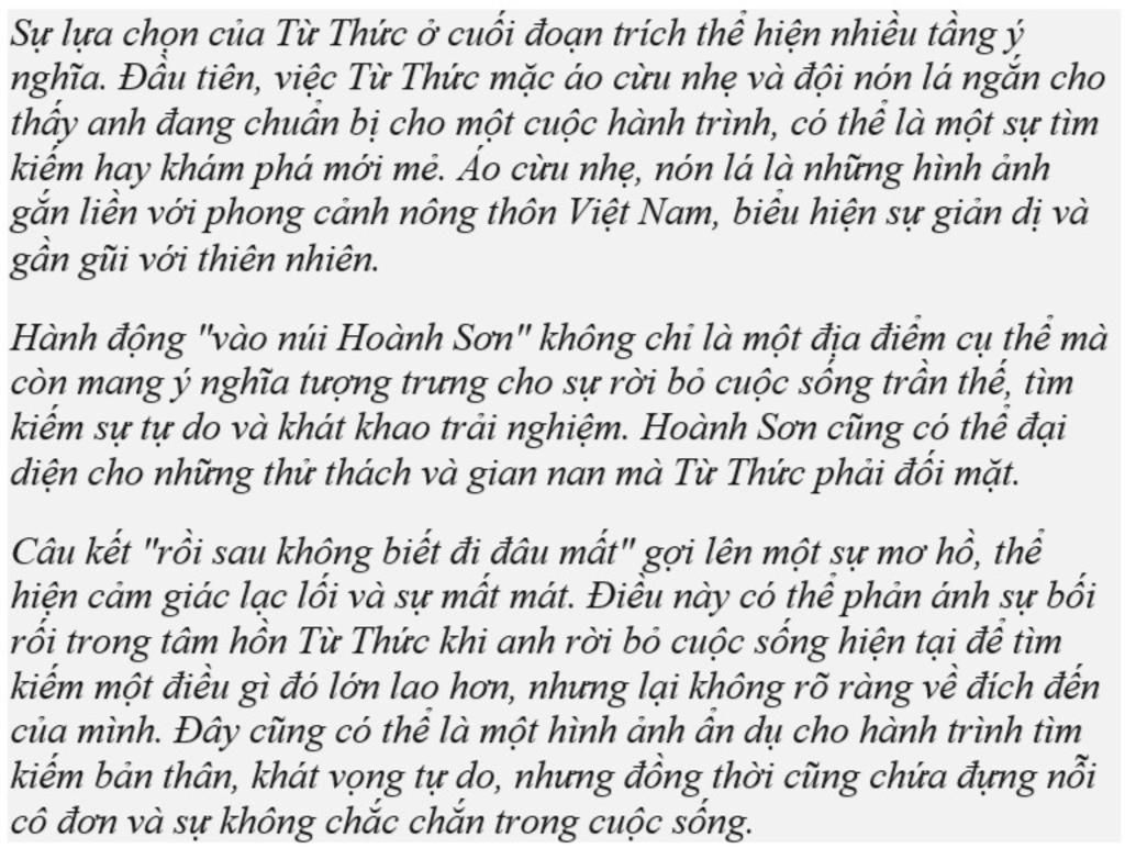 Anh/Chị hãy lí giải sự lựa chọn của Từ Thức ở cuối đoạn trích: Chàng bèn mặc áo cừu nhẹ, đội nón lá ngắn, vào núi Hoành Sơn, rồi sau không biết đi đâu mất.