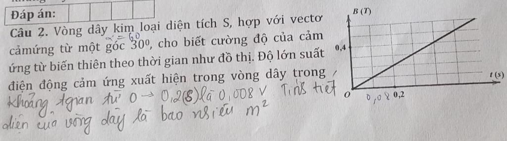 Từ đồ thị, ta thấy độ biến thiên của `B (ΔB)` từ `0 -> 0.2` giây là `0.4 T`
