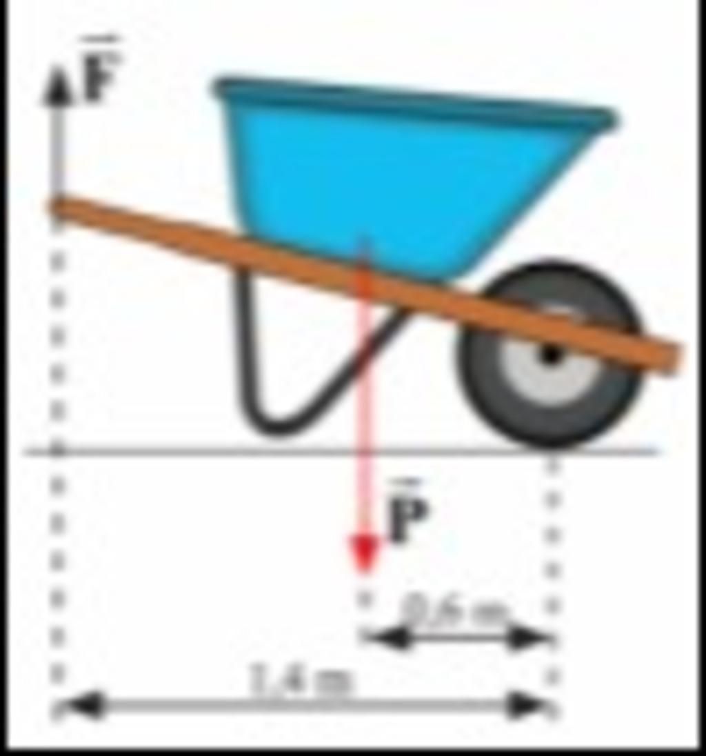 Bài 2. Một chiếc xe đẩy chuyển vật liệu có cấu tạo như hình. Tổng khối lượng vật liệu và xe là 100kg. Áp dụng quy tắc moment, tính lực nâng đặt vào tay cầm để giữ xe thăng bằng. Lấy g = 9,8 m/s2.