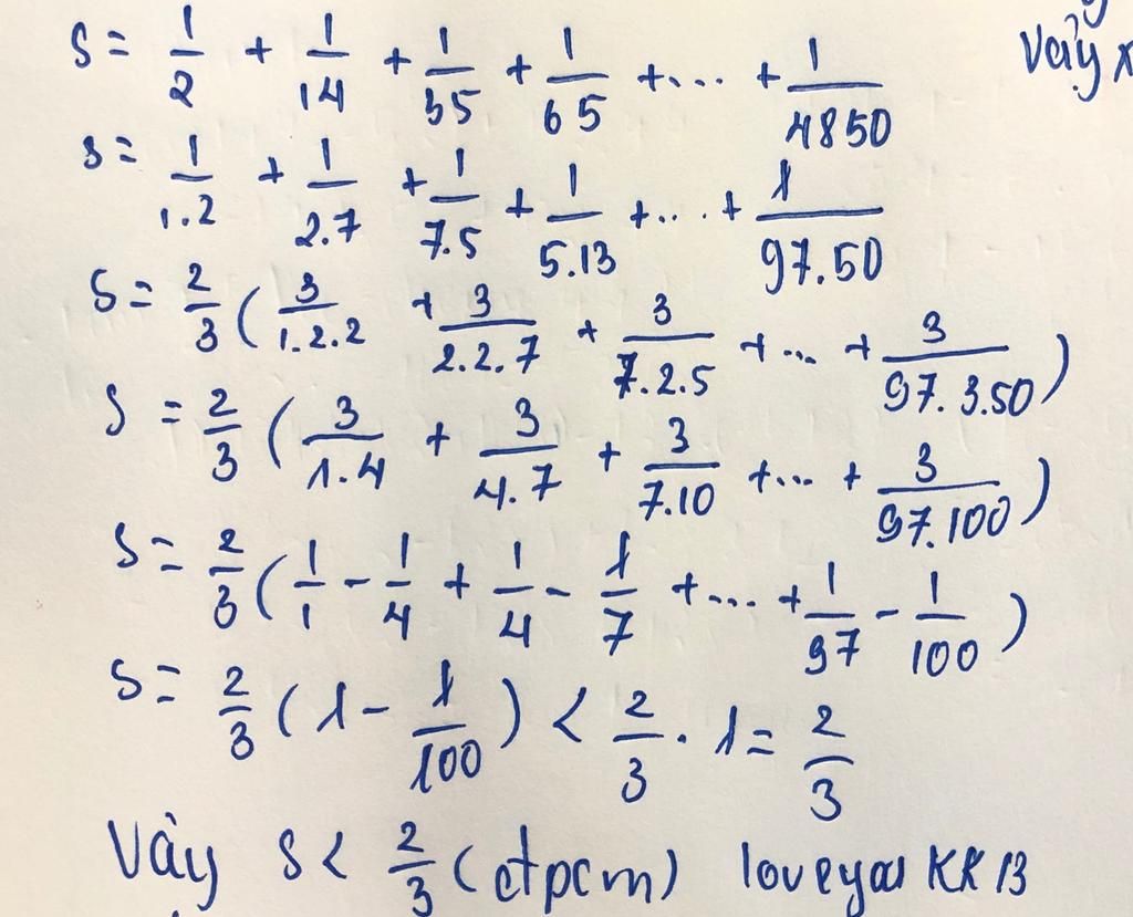 s=1/2 + 1/14 + 1/35 + 1/65 + ... + 1/4850. chứng minh rằng S<2/3