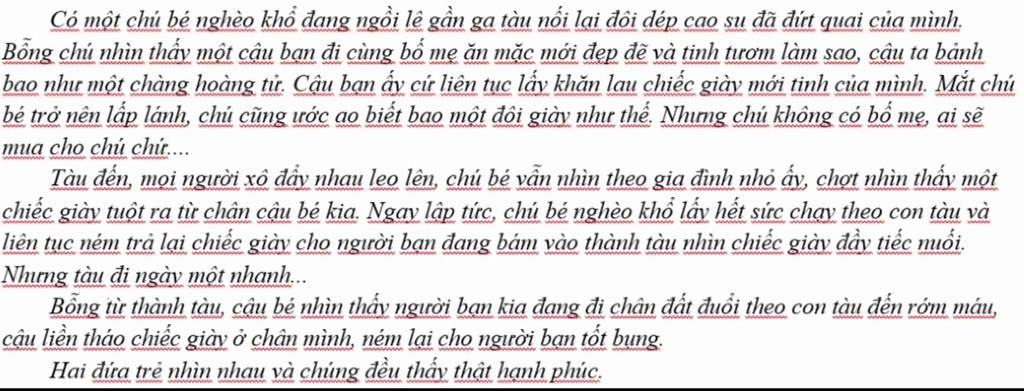 Mẩu truyện trên đã gửi gắm đến bạn đọc một niềm xúc động, xuyến xao bởi hành động tốt đẹp, cao cả của hai câu bé. Cậu bé nghèo khổ đã chạy hết sức để trả lại bạn kia khi thấy giày rơi ra dù cho đôi chân mình đã bị nhuốm máu, tổn thương. Đó là một cậu bé tốt bụng, nhân hậu, thiện lương, sẵn sàng giúp đỡ người khác , không bị sự tham lam, ham muốn che mờ đôi mắt. Bên cạnh đó cậu bạn kia cũng là người có một trái tim, tâm hồn tốt đẹp, biết cách ứng xử đúng đắn, dù rất yêu thích chiếc giày nhưng cậu vẫn sẵn sàng ném lại cho người bạn nghèo như thể hiện lòng biết ơn, sự cảm ơn chân thành khi thấy cậu bé nghèo cố gắng đuổi theo trả lại đôi giày bị rớt. Cái "hạnh phúc" cuối mẩu truyện ấy có lẽ là sợi dây nối liền hai trái tim nhỏ bé nhưng chất chứa bao tình yêu thương rộng lớn mênh mông của những người tốt bụng, nhân ái đến với nhau.