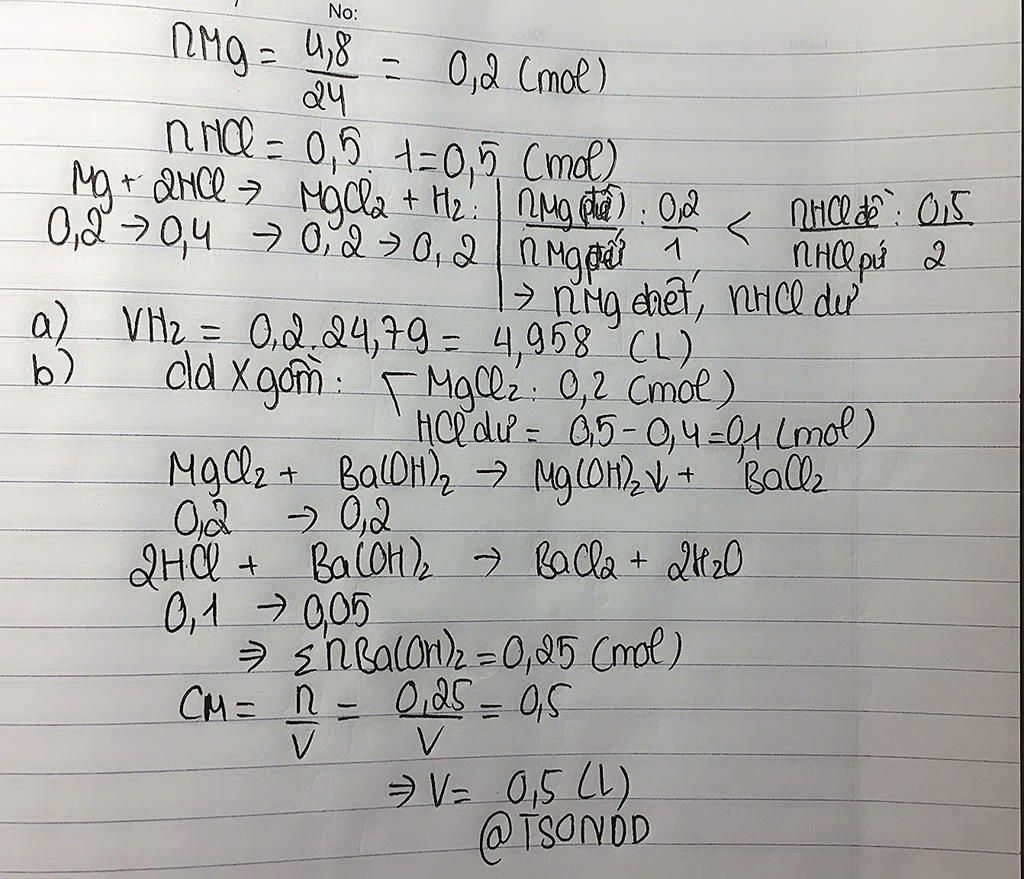 Bài 16. Cho 4,8 gam bột Mg vào 500 mL dung dịch HCI 1 M. Sau khi phản ứng xảy ra hoàn toàn, thụ được dung dịch X và V lít khí H2 (đkc):