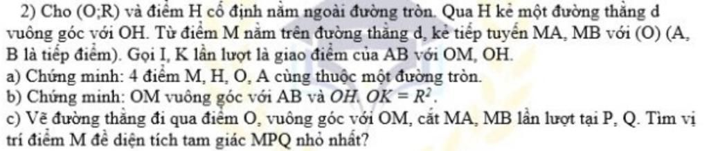 c.Vì $MA, MB$ là tiếp tuyến của $(O)$