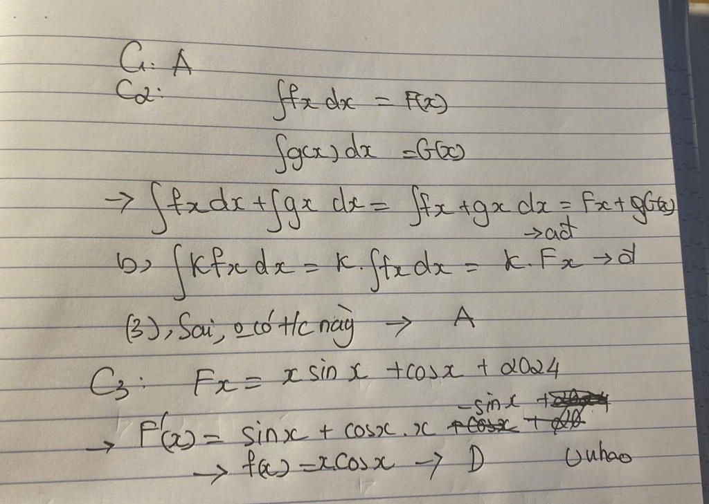 Câu 3:Hàm số F(x)=xsinx+cosx+2024 là một nguyên hàm của hàm số nào trong các hàm số sau?