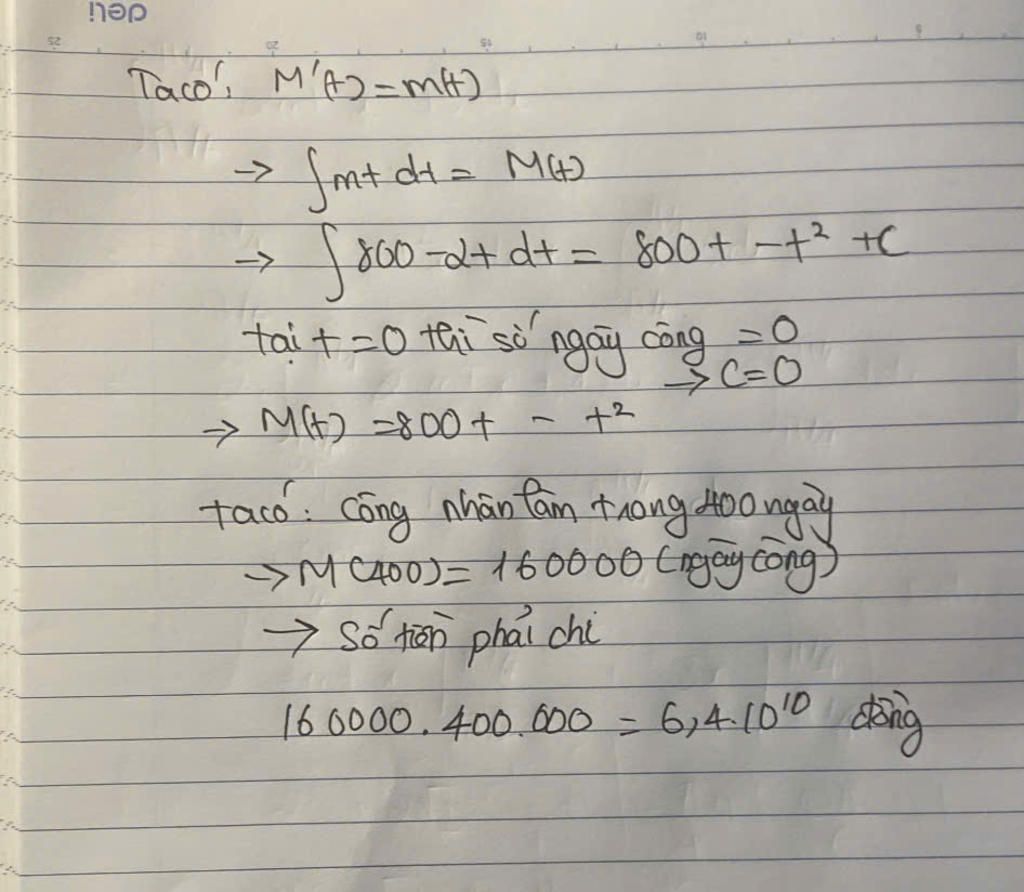 Một công trình xây dựng dự kiến hoàn thành trong 400 ngày. Số lượng công nhân được sử dụng cho bởi hàm số m(t)=800-2t, trong đó t tính theo ngày (0≤t≤400),m(t) tính theo người