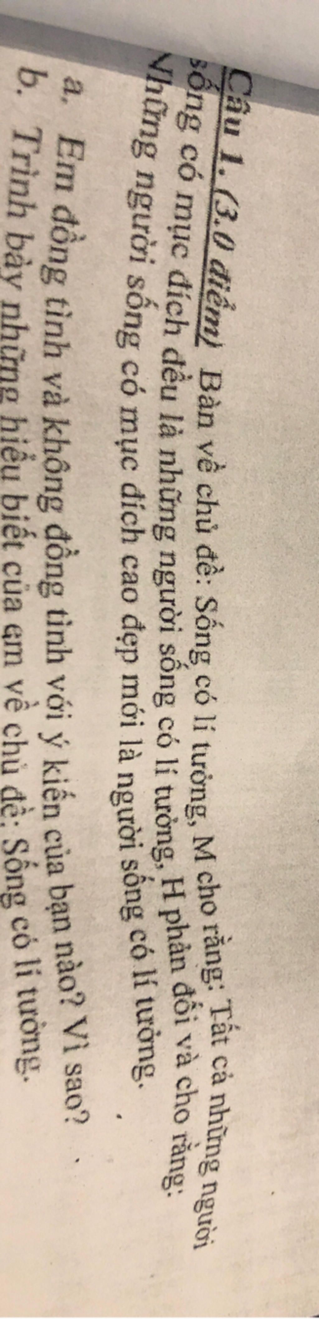a) Em đồng tình với bạn H nhưng không đồng tình với bạn M . Vì chỉ nói đến mục đích thì chắc hẳn đó chưa chắc đã là sống có lí tưởng vì mục đích đôi khi cũng có thể là mục đích xấu khiến cho người ta lầm tưởng về việc sống có kí tưởng.