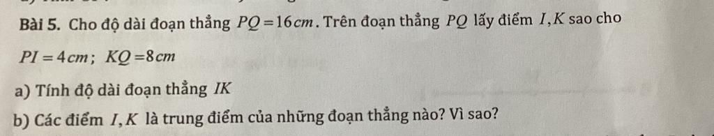 `a)`Ta có:`IK = PQ - PI - KQ = 16 - 4 - 8 = 4cm`