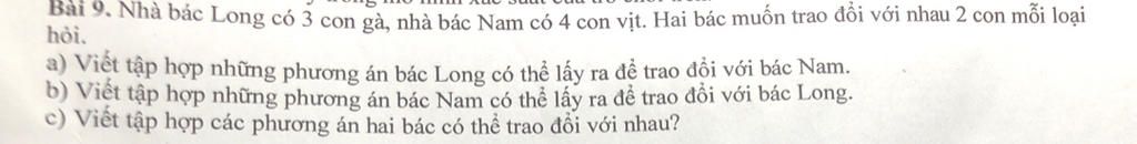 c) Để viết tập hợp các phương án hai bác có thể trao đổi với nhau, chúng ta cần kết hợp các phương án của bác Long và bác Nam sao cho tổng số con vật trao đổi là 2 con mỗi loại.