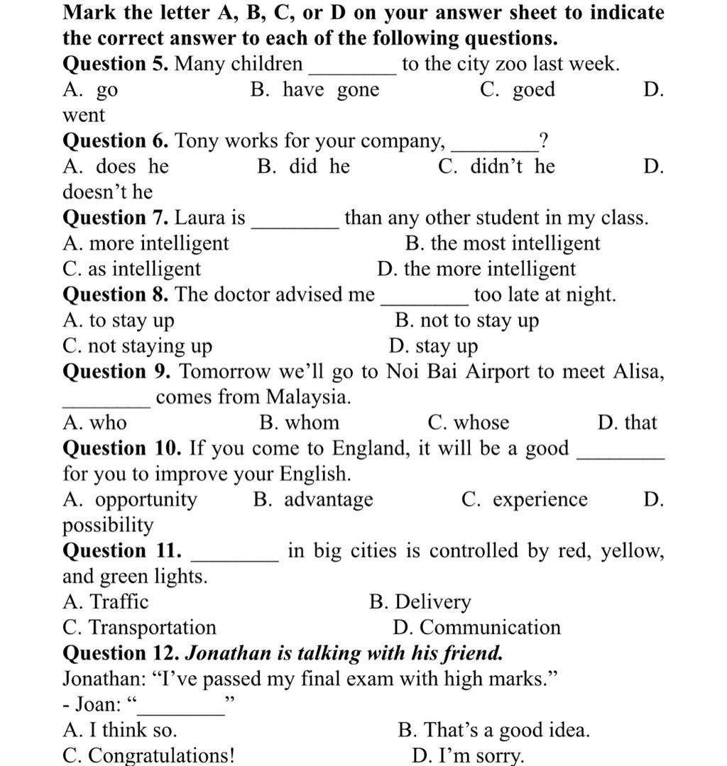 - Dựa vào nghĩa câu, chọn B là phù hợp nhất.