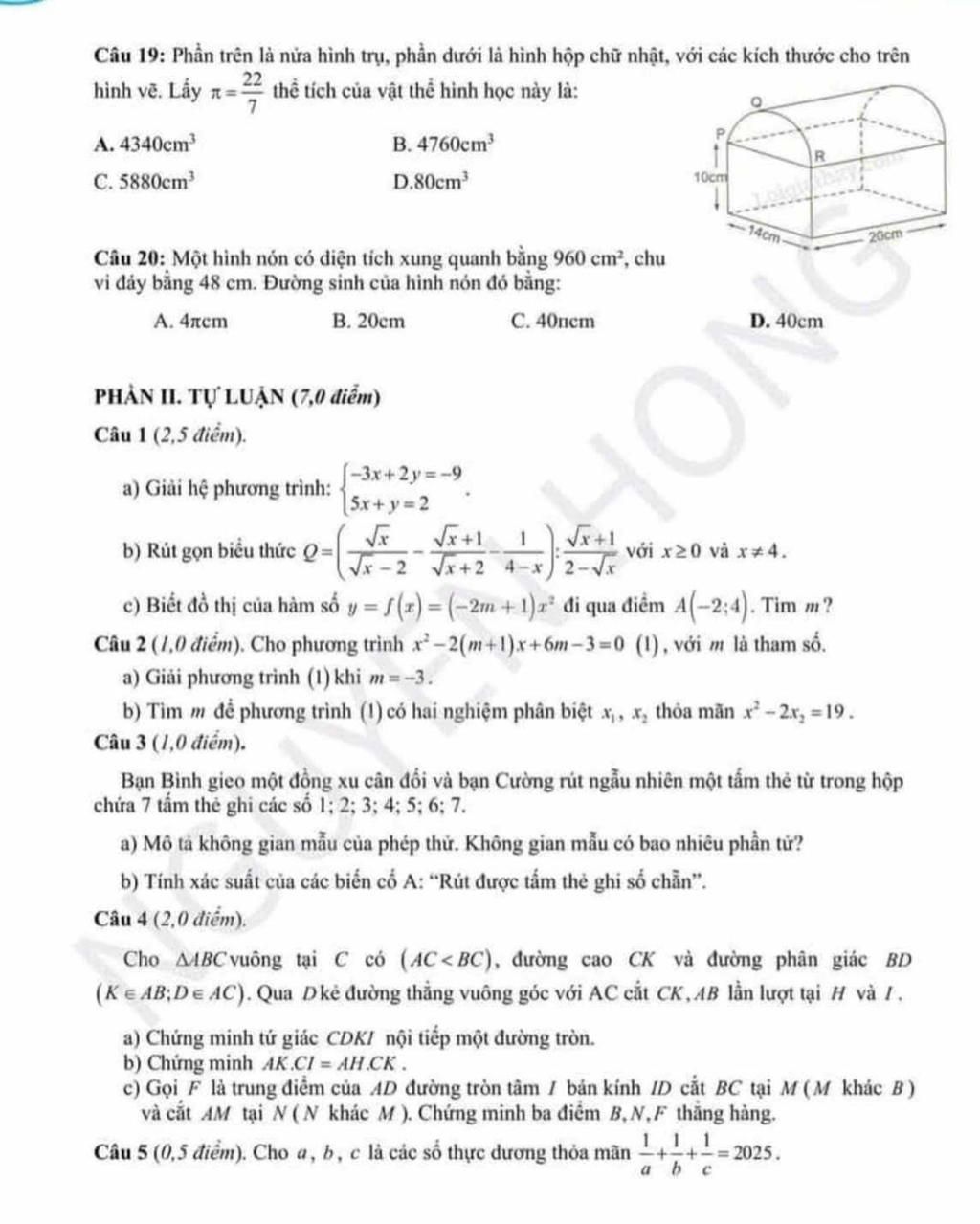 Câu 19: Phần trên là nửa hình trụ, phần dưới là hình hộp chữ nhật, với các kích thước cho trên