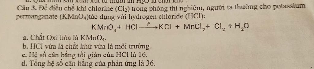 `2KMnO_4 + 16HCl -> 2KCl + 2MnCl_2 + 5Cl_2 + 8H_2O`
