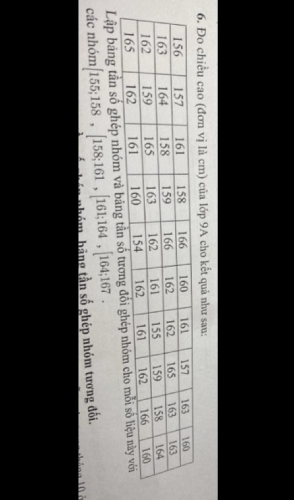 \begin{array}{|c|c|c|}\hline \text{$Nhóm$}&\text{$[155;158)$}&\text{$[158;161)$}&\text{$[161;164)$}&\text{$[164;167)$}&N\\\hline \text{$Tần số$}&\text{$4$}&\text{$10$}&\text{$17$}&\text{$8$}&\text{$40$}\\\hline \text{$Tần số tương đối$%}&\text{$10,2$%}&\text{$25,6$%}&\text{$43,5$%}&\text{$20,5$%}&\text{$$}\\\hline \end{array}