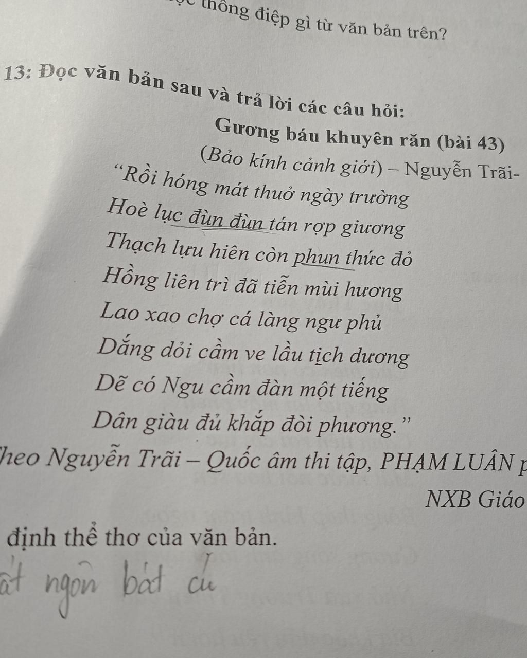 `@` Thật ra, nếu xét về số lượng chuẩn thì có câu `(1)` và câu `(8)` là duy chỉ chứa `6` chữ, và tổng số chữ của cả bài thơ sẽ là `54` . Nhưng chung quy, người ta vẫn xét đủ và quy ước bài thơ có dạng : Thất ngôn bát cú.