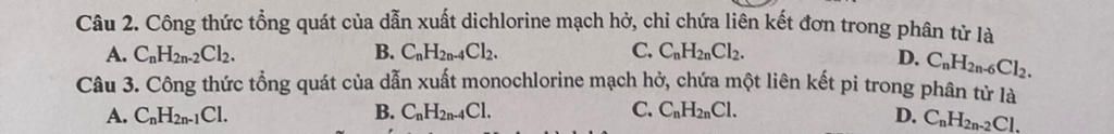 Công thức phân tử : $\rm C_2H_4Cl_2$ `=>` công thức tổng quát $\rm C_nH_{2n}Cl_2$