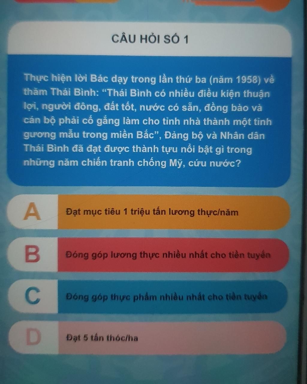 Giải thích: Lời dạy của Bác Hồ nhấn mạnh vào việc Thái Bình cần trở thành tỉnh gương mẫu trong sản xuất nông nghiệp. Trong điều kiện chiến tranh ác liệt, việc đóng góp lương thực cho tiền tuyến là một thành tựu nổi bật thể hiện sự nỗ lực của Đảng bộ và nhân dân Thái Bình trong việc thực hiện lời dạy của Bác