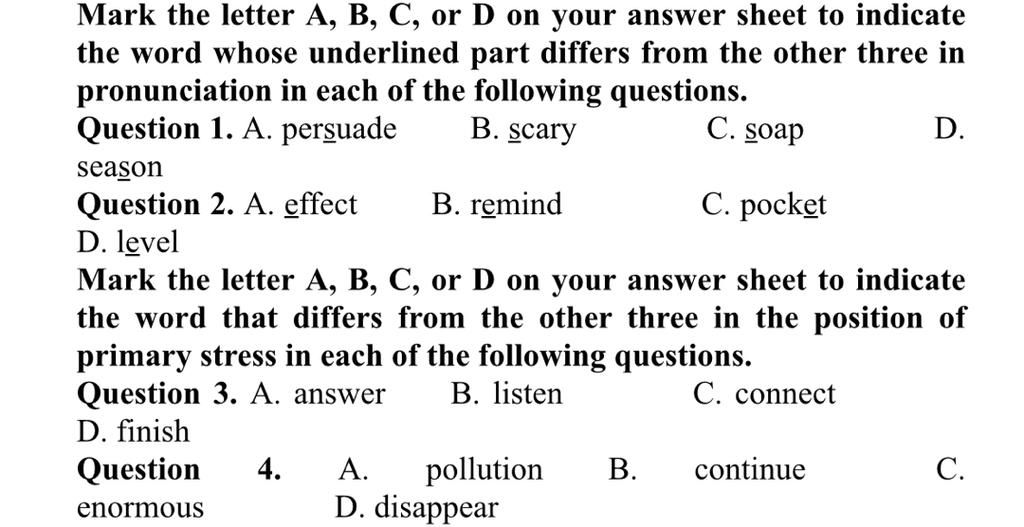Question `4` : `D` trọng âm rơi vào âm tiết `3`, còn lại rơi âm tiết `2`
