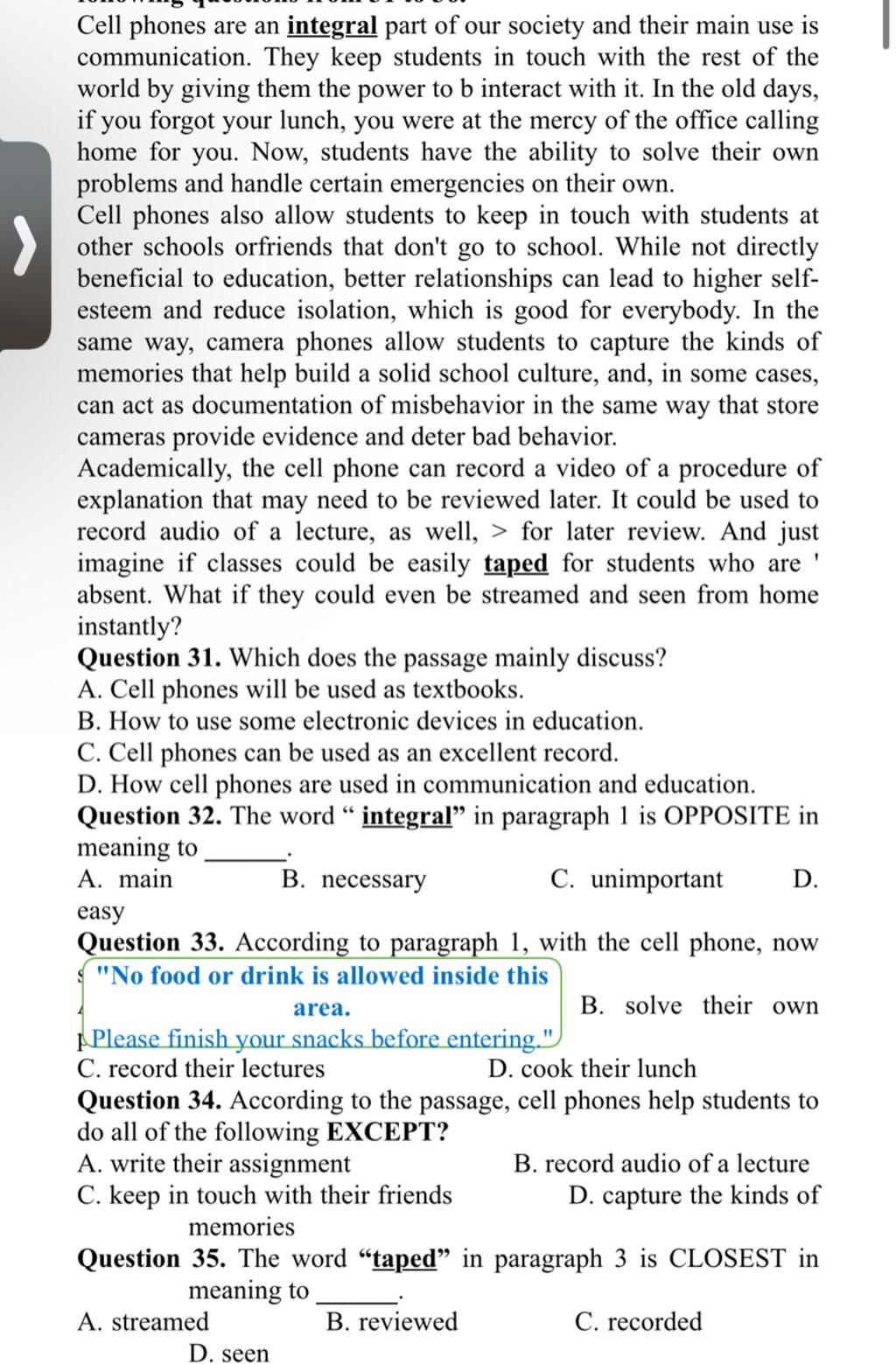 → Giải thích: Đoạn văn không đề cập đến việc học sinh có thể sử dụng điện thoại để viết bài tập, mà chỉ nói về việc liên lạc, ghi âm bài giảng và lưu giữ kỷ niệm.