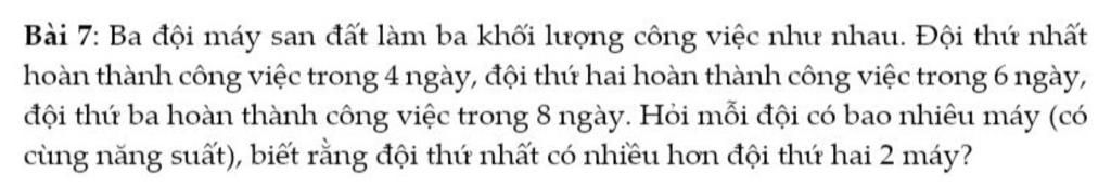 Vì các máy có cùng năng suất nên số máy và số ngày hoàn thành công việc là hai đại lượng tỉ lệ nghịch, ta có: `4x=6y=8z=>x/(1/4)=y/(1/6)=z/(1/8)`