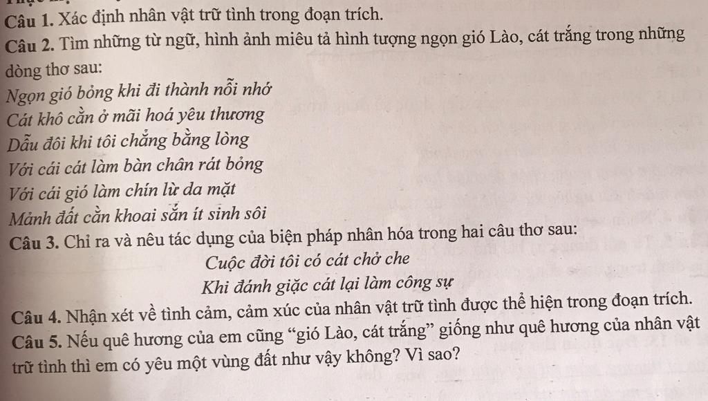 ( Mặc dù cuộc sống ở vùng đất gió Lào cát trắng đầy gian khổ , khó khăn , nhân vật trữ tình vẫn dành một tình cảm đặc biệt cho nơi này . " Ngọn gió Lào cát trắng của đời tôi " , " Tôi của cát của gió Lào khắc nghiệt " là những câu thơ thể hiện sự gắn bó máu thịt , coi đây là một phần không thể thiếu của cuộc đời mình . )