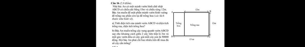 Nhà bác An có một mảnh vườn hình chữ nhật ABCD có chiều dài bằng 15 m và chiều rộng 12m. Bác An muốn để một phần mảng vườn hình vuông có cạnh 12m để trồng rau. Phần còn lại 12m Bác An muốn trồng cây xung quanh vườn ABCD sao cho khoảng cách giữa hai cây liên tiếp là 3m và mỗi góc vườn đều có cây; giá mỗi cây là 50000 đồng. Hỏi bác An phải chi bao nhiêu tiền để mua đủ số cây cần trồng?