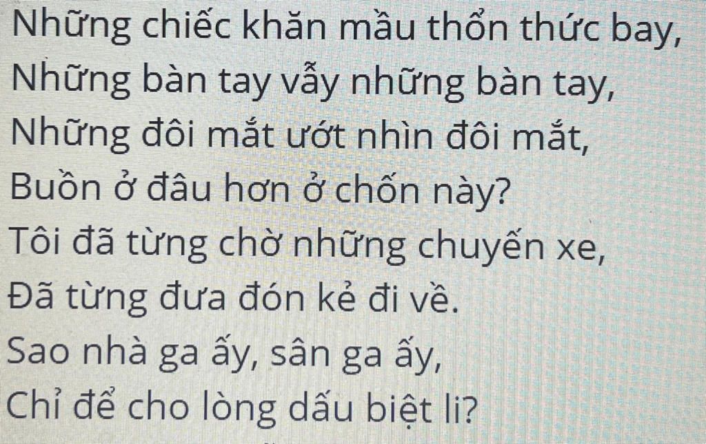 Đoạn thơ trên thể hiện rõ tâm trạng buồn bã, lưu luyến và đầy xúc cảm của nhân vật trữ tình khi chứng kiến cảnh chia ly tại sân ga. Hình ảnh "những chiếc khăn màu thổn thức bay", "những bàn tay vẫy những bàn tay", "những đôi mắt ướt nhìn đôi mắt" gợi lên không khí bịn rịn, xúc động, nơi những con người sắp xa nhau trao nhau cái nhìn cuối cùng. Điệp từ "những" được lặp lại nhiều lần càng nhấn mạnh sự phổ biến của những cuộc tiễn đưa, khiến sân ga trở thành nơi gắn liền với nỗi buồn ly biệt. Câu hỏi tu từ "Buồn ở đâu hơn ở chốn này?" thể hiện sự day dứt, xót xa khi nhận ra sân ga không chỉ là nơi khởi hành mà còn là nơi chứng kiến vô số cuộc chia xa. Sự từng trải của nhân vật trữ tình được bộc lộ qua câu thơ "Tôi đã từng chờ những chuyến xe, đã từng đưa đón kẻ đi về", cho thấy đây không phải lần đầu chứng kiến cảnh biệt ly, nhưng cảm xúc vẫn vẹn nguyên như thuở ban đầu. Câu hỏi cuối cùng "Sao nhà ga ấy, sân ga ấy, chỉ để cho lòng dấu biệt li?" vang lên như một lời trách móc, như một nỗi niềm chưa thể nguôi ngoai. Đoạn thơ không chỉ diễn tả tâm trạng buồn thương của nhân vật trữ tình mà còn gợi lên sự đồng cảm với những ai từng trải qua những cuộc chia ly trong đời.