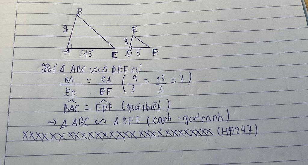 cho tam giác DEF và ABC có DE= 3 cm DF= 5 cm AB = 9 cm AC=15 cm góc D = góc A chứng minh rằng tam giác DEF đồng dạng với tam giác ABC