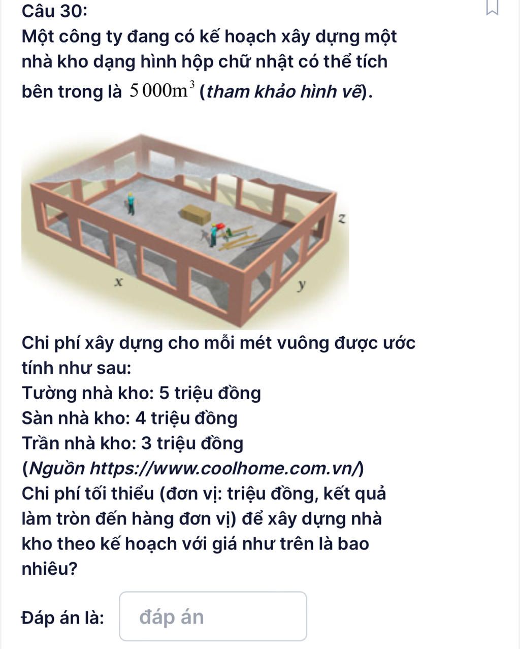 $\to$Chi phí xây dựng nhỏ nhất là $7789$ triệu đồng