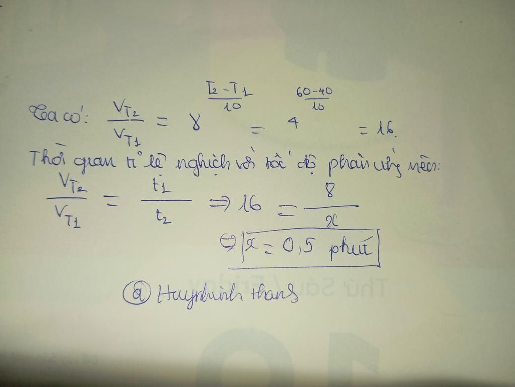 Để đánh giá mức độ xảy ra nhanh hay chậm của phản ứng hóa học người ta dùng khái niệm tốc độ phản ứng. Biết khi tăng nhiệt độ lên 10độ C, tốc độ của phản ứng (1) tăng lên 4 lần. Ở 40 độ C, thời gian để phản ứng (1) xảy ra hoàn toàn là 8 phút. Nếu tiến hành phản ứng ở 60 độ C với cùng lượng chất X và các điều kiện phản ứng khác được giữ không đổi thì thời gian phản ứng (1) xảy ra hoàn toàn là x phút. Giá trị của x là bao nhiêu? (kết quả làm tròn đến hàng phần mười).