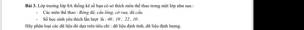 _ Dữ liệu định lượng là số học sinh yêu thích các môn trên lần lượt: