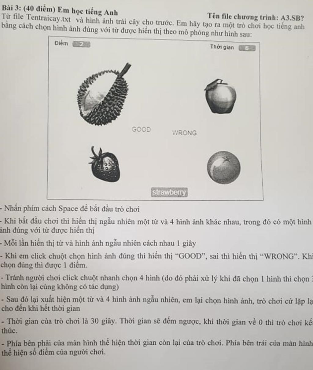 Từ file Tentraicay.txt và hình ảnh trái cây cho trước. Em hãy tạo ra một trò chơi học tiếng anh