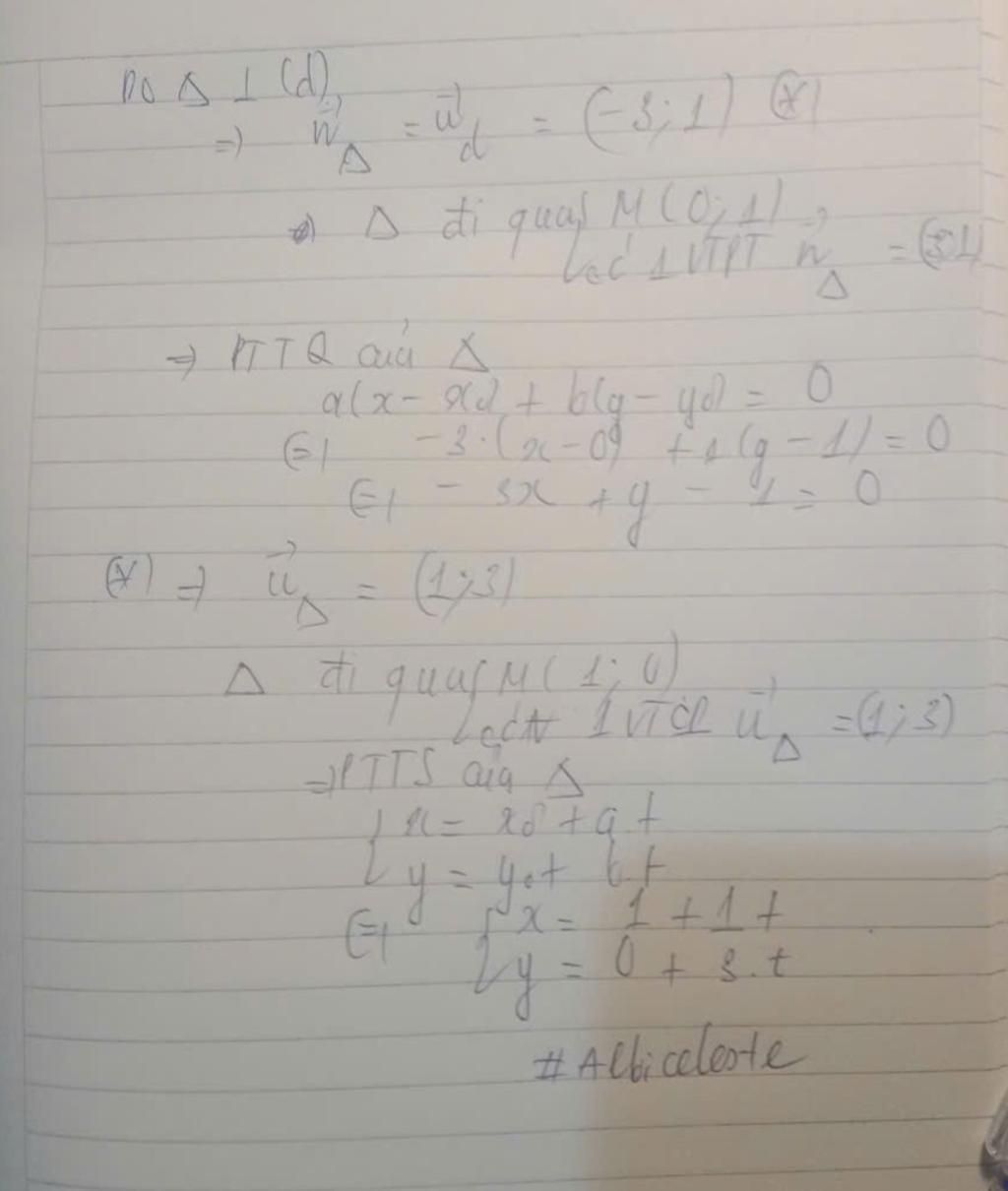 Trong mặt phẳng tạo độ oxy cho đường thẳng d x = 2-3t , y = 1 + t viết phương trình tham số và phương trình tổng quát của đường thẳng tam giác đi qua M (0,1) và vuông góc với d