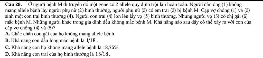 Vì cả $(4)$ và $(5)$ đều mag allen bệnh `=>` con sinh ra có khả năng sẽ mang allen bệnh