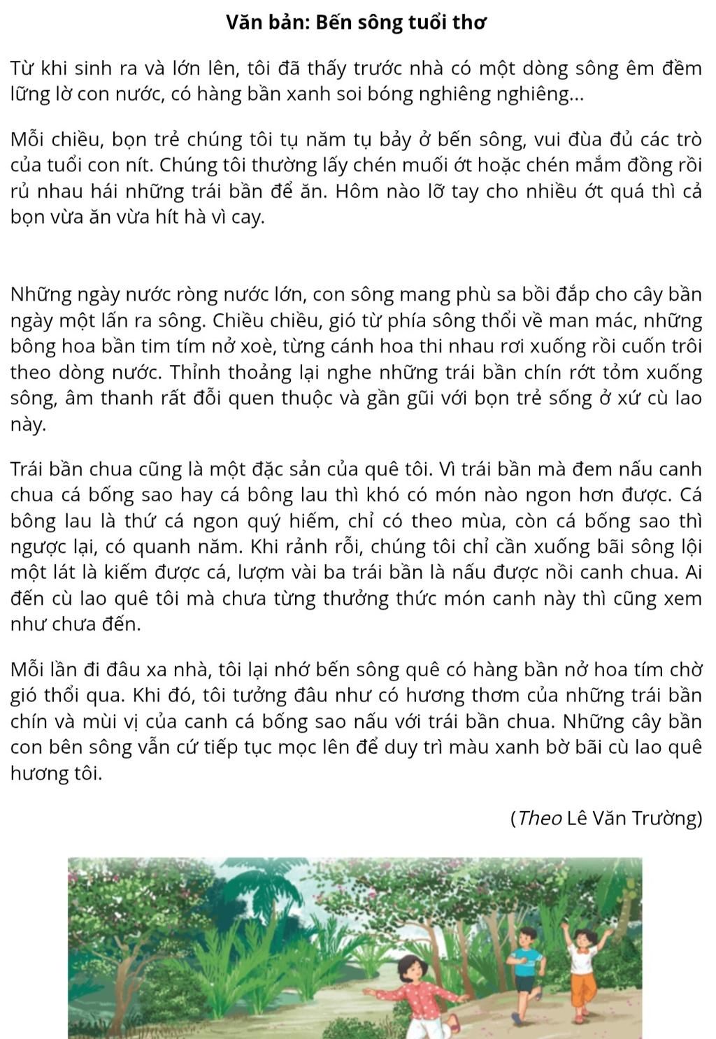 Bức tranh minh họa bài Bến sông tuổi thơ tái hiện khung cảnh bình yên của vùng quê với dòng sông xanh mát và hàng cây bần mọc ven bờ. Những bông hoa bần tím rơi xuống mặt nước, tạo nên vẻ đẹp thơ mộng, khiến người xem cảm nhận được sự yên bình của quê hương. Trong tranh, những đứa trẻ vừa chạy nhảy, vừa vui đùa hồn nhiên bên bờ sông. Khung cảnh ấy không chỉ gợi lên kỷ niệm tuổi thơ mà còn thể hiện tình cảm gắn bó với quê nhà. Dòng sông không chỉ là nơi bọn trẻ vui chơi mỗi ngày mà còn gắn liền với ký ức tuổi thơ của chúng, khiến ai đi xa cũng nhớ về.