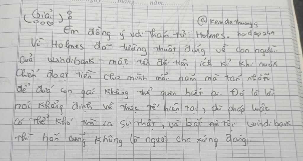 Em có đồng ý với thám tử Holmes về Windibank sau đây không?: “Có thể là pháp luật không làm gì được ông. Nhưng hành động của ông thật là vô cùng đê tiện, tàn nhẫn và ích kỷ....”.