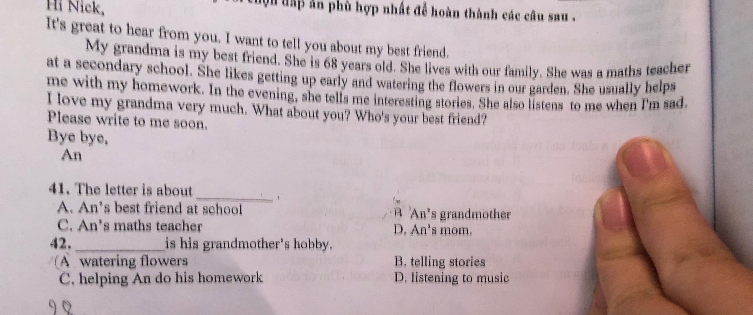 → ngay chữ đầu đã nói đến đáp án " my grandma" từ này đồng nghĩa với từ grandmother, cuối thư để lại bút danh " An" nghĩa là bạn An viết thư cho bạn Nick và kể về bà của mình.