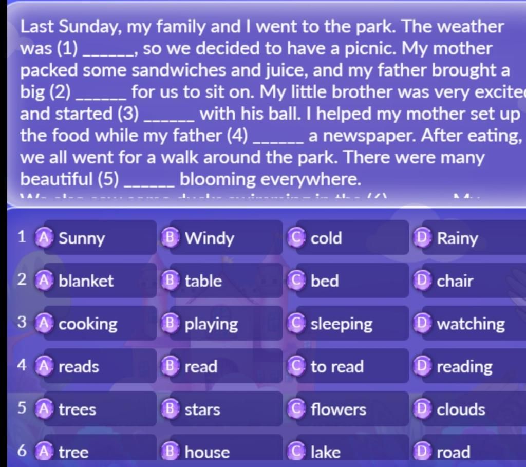 Last Sunday, my family and I went to the park. The weather was `(1)` Sunny, so we decided to have a picnic.