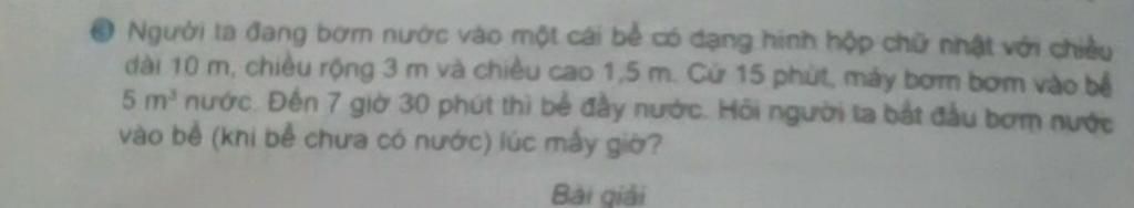 Để bơm nước đầy `45` `m^3` cần số lần bơm là: