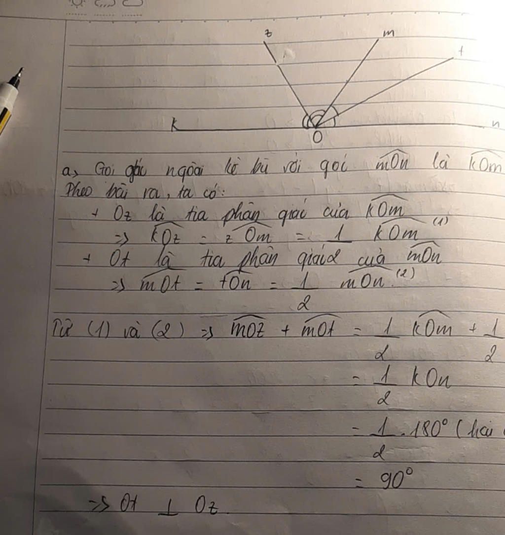 Cho góc mOn khác góc tù. Kẻ tia phân giác Ot của góc mOn và tia phân giác Oz của góc ngoài kề bù với góc mOn. Chứng minh: