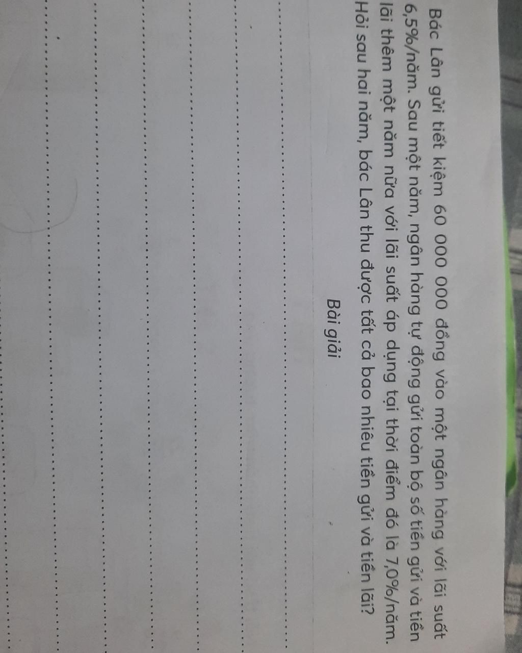 `60` `000` `000 + 60` `000` `000 xx 6,5% = 63` `900` `000` (đồng)